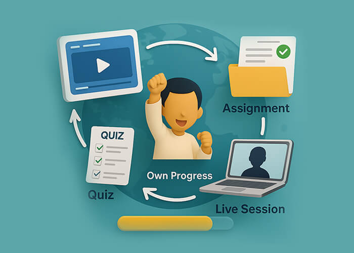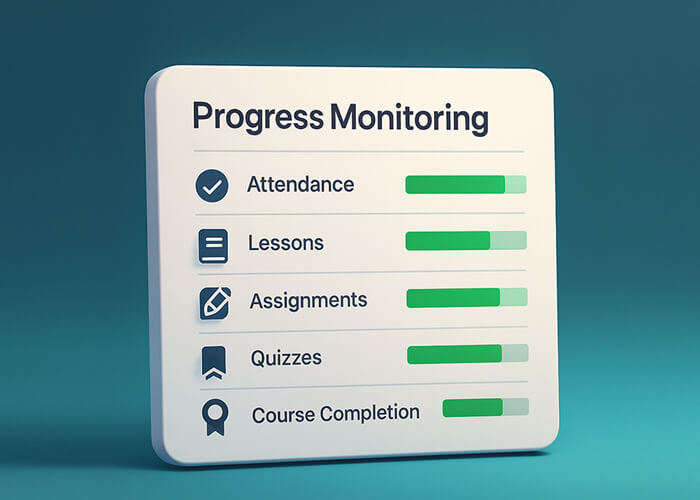 Student progress is tracked through detailed LMS reports covering attendance, lessons, assignments, quizzes, and course completion. Parents can log in anytime to view progress, strengths, and areas for improvement, ensuring transparency and keeping students motivated to grow step by step.